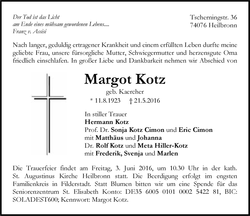 Hier finden Sie alle Traueranzeigen aus der Zeitung, die bisher für Margot Kotz erschienen sind. Weitere Traueranzeigen, die in der Zeitung erscheinen, werden hier ebenfalls aufgelistet