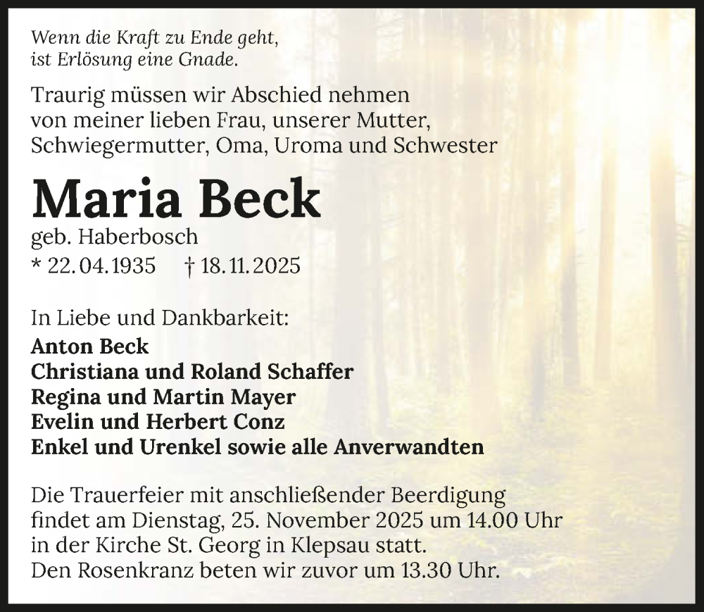 Hier finden Sie alle Traueranzeigen aus der Zeitung, die bisher für Maria Beck erschienen sind. Weitere Traueranzeigen, die in der Zeitung erscheinen, werden hier ebenfalls aufgelistet