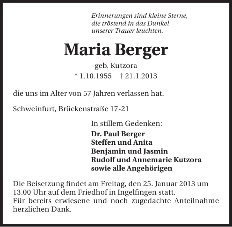Hier finden Sie alle Traueranzeigen aus der Zeitung, die bisher für Maria Berger erschienen sind. Weitere Traueranzeigen, die in der Zeitung erscheinen, werden hier ebenfalls aufgelistet