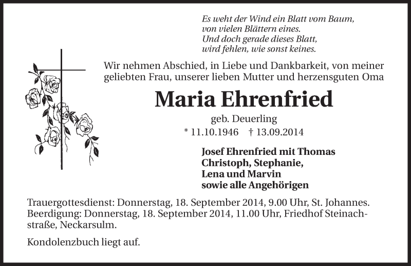 Hier finden Sie alle Traueranzeigen aus der Zeitung, die bisher für Maria Ehrenfried erschienen sind. Weitere Traueranzeigen, die in der Zeitung erscheinen, werden hier ebenfalls aufgelistet