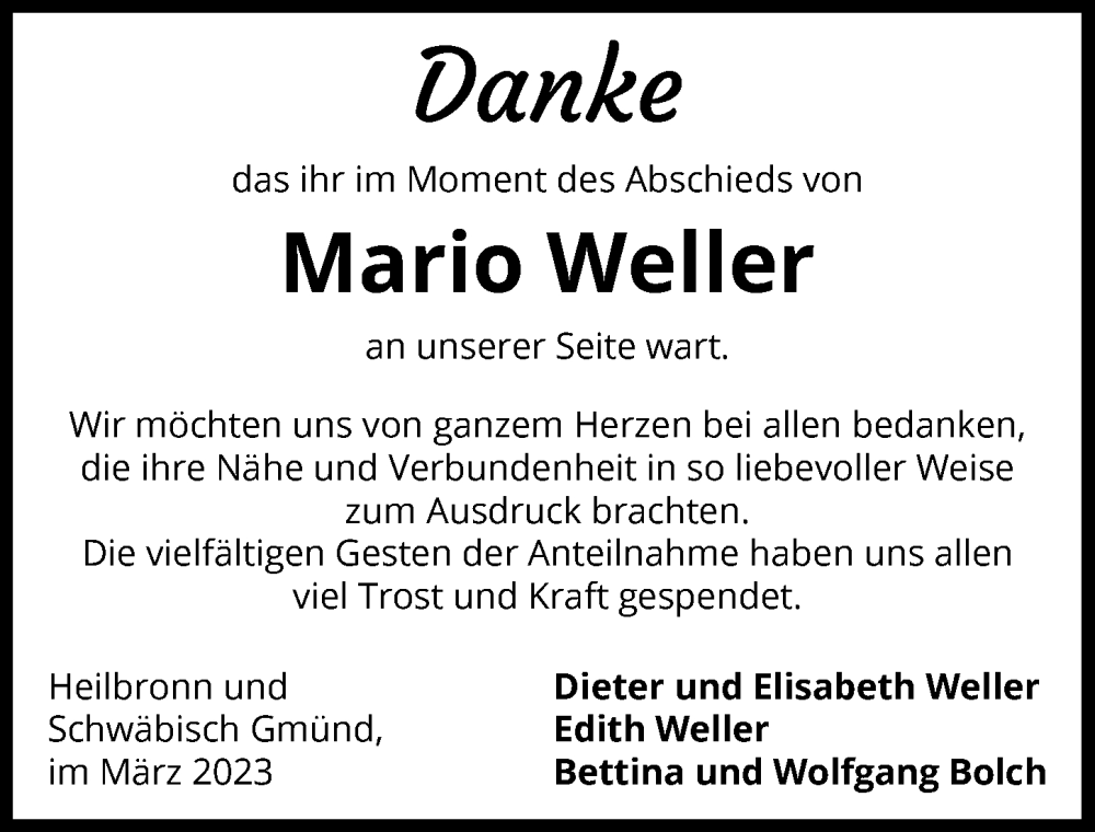 Hier finden Sie alle Traueranzeigen aus der Zeitung, die bisher für Mario Weller erschienen sind. Weitere Traueranzeigen, die in der Zeitung erscheinen, werden hier ebenfalls aufgelistet