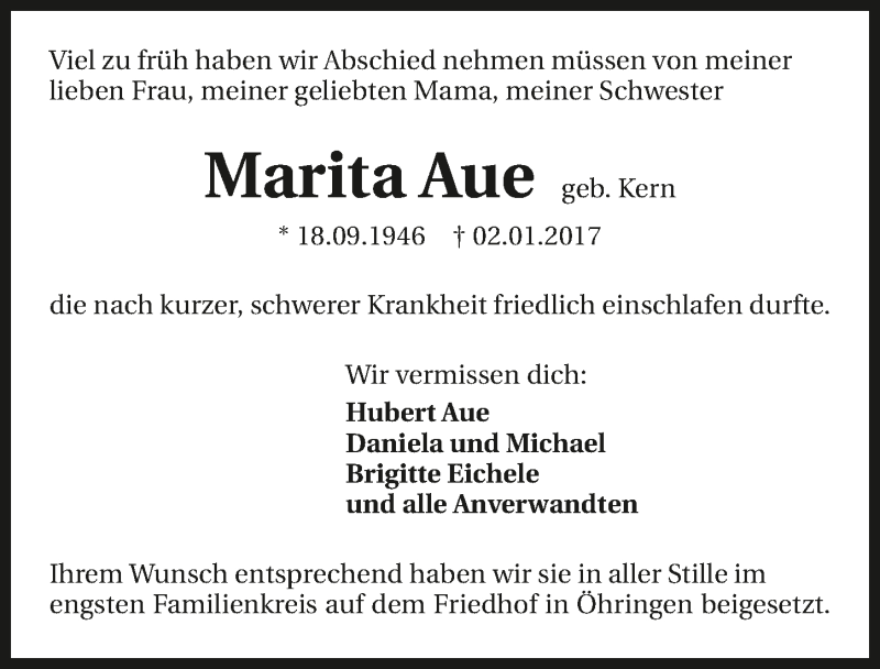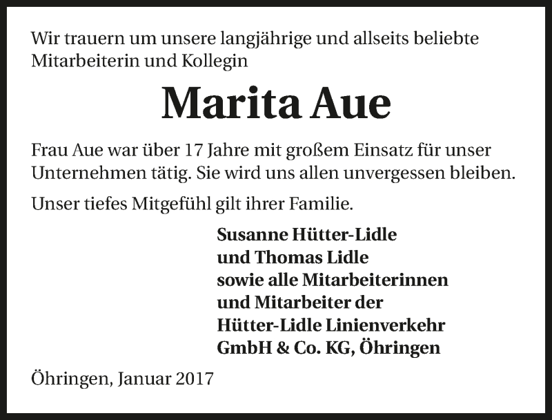 Hier finden Sie alle Traueranzeigen aus der Zeitung, die bisher für Marita Aue erschienen sind. Weitere Traueranzeigen, die in der Zeitung erscheinen, werden hier ebenfalls aufgelistet