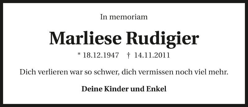 Hier finden Sie alle Traueranzeigen aus der Zeitung, die bisher für Marliese Rudigier erschienen sind. Weitere Traueranzeigen, die in der Zeitung erscheinen, werden hier ebenfalls aufgelistet