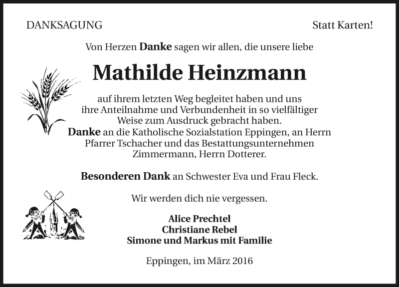 Hier finden Sie alle Traueranzeigen aus der Zeitung, die bisher für Mathilde Heinzmann erschienen sind. Weitere Traueranzeigen, die in der Zeitung erscheinen, werden hier ebenfalls aufgelistet
