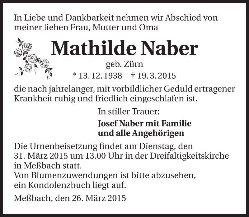 Hier finden Sie alle Traueranzeigen aus der Zeitung, die bisher für Mathilde Naber erschienen sind. Weitere Traueranzeigen, die in der Zeitung erscheinen, werden hier ebenfalls aufgelistet