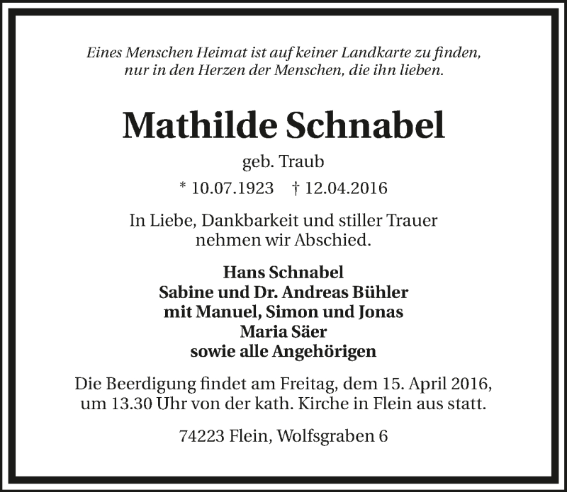 Hier finden Sie alle Traueranzeigen aus der Zeitung, die bisher für Mathilde Schnabel erschienen sind. Weitere Traueranzeigen, die in der Zeitung erscheinen, werden hier ebenfalls aufgelistet