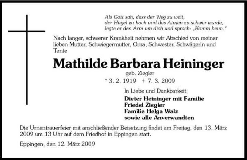 Hier finden Sie alle Traueranzeigen aus der Zeitung, die bisher für Mathilde Barbara Heininger erschienen sind. Weitere Traueranzeigen, die in der Zeitung erscheinen, werden hier ebenfalls aufgelistet