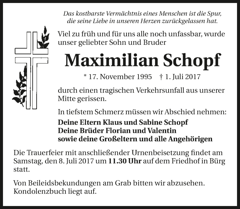 Hier finden Sie alle Traueranzeigen aus der Zeitung, die bisher für Maximilian Schopf erschienen sind. Weitere Traueranzeigen, die in der Zeitung erscheinen, werden hier ebenfalls aufgelistet