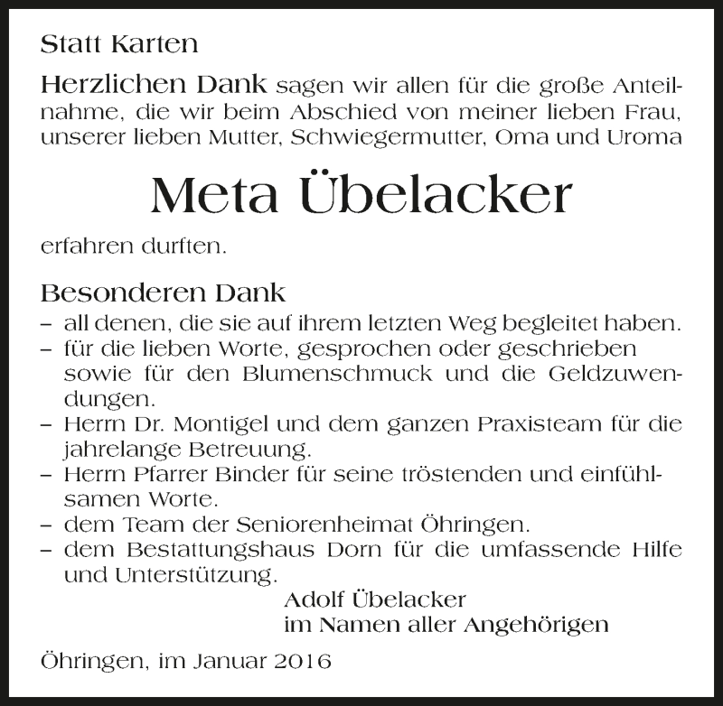 Hier finden Sie alle Traueranzeigen aus der Zeitung, die bisher für Meta Übelacker erschienen sind. Weitere Traueranzeigen, die in der Zeitung erscheinen, werden hier ebenfalls aufgelistet