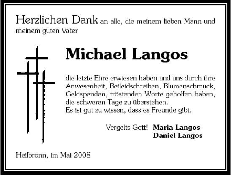 Hier finden Sie alle Traueranzeigen aus der Zeitung, die bisher für Michael Langos erschienen sind. Weitere Traueranzeigen, die in der Zeitung erscheinen, werden hier ebenfalls aufgelistet