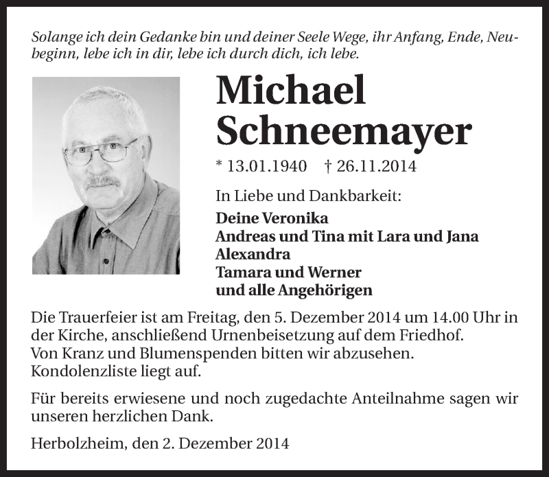 Hier finden Sie alle Traueranzeigen aus der Zeitung, die bisher für Michael Schneemayer erschienen sind. Weitere Traueranzeigen, die in der Zeitung erscheinen, werden hier ebenfalls aufgelistet