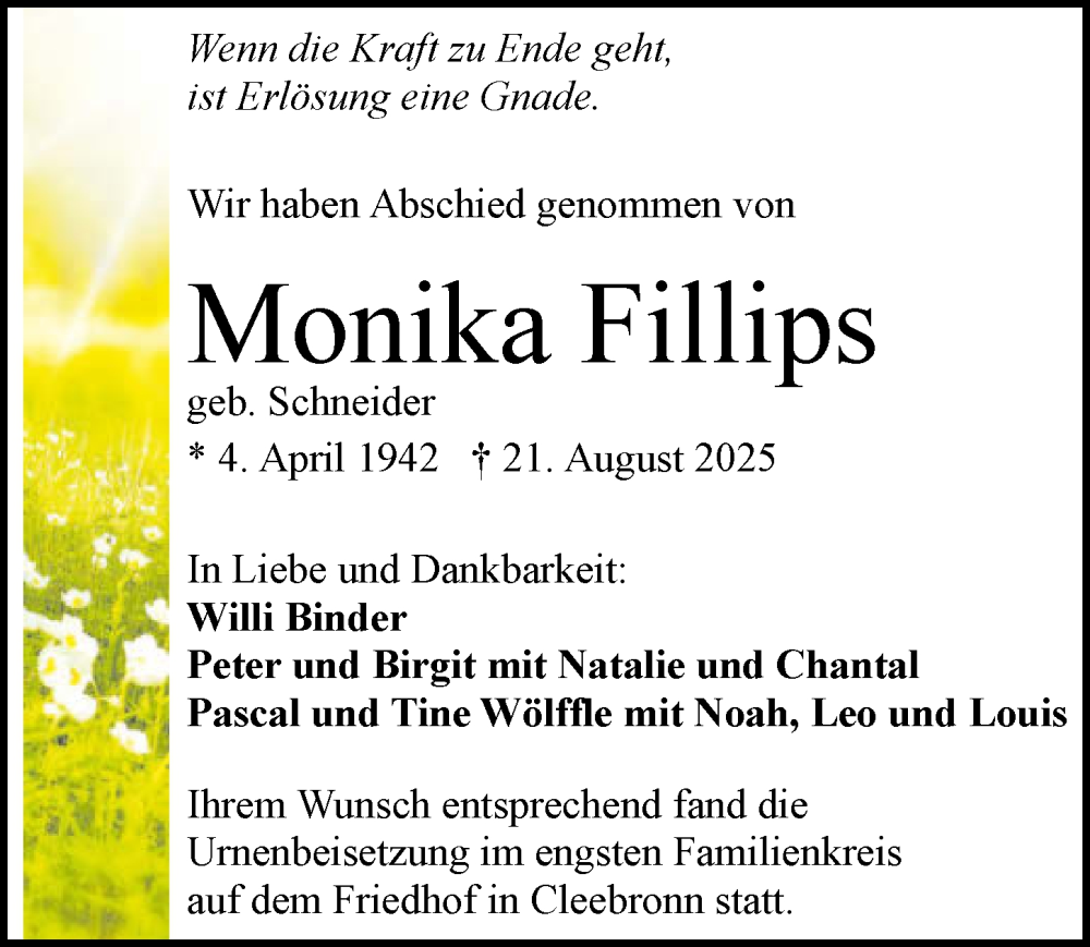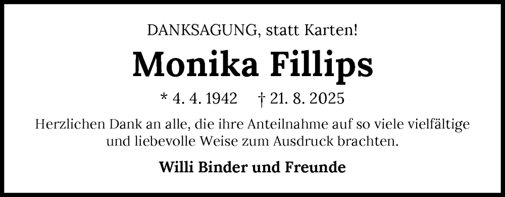 Hier finden Sie alle Traueranzeigen aus der Zeitung, die bisher für Monika Fillips erschienen sind. Weitere Traueranzeigen, die in der Zeitung erscheinen, werden hier ebenfalls aufgelistet