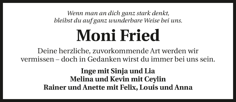 Hier finden Sie alle Traueranzeigen aus der Zeitung, die bisher für Monika Fried erschienen sind. Weitere Traueranzeigen, die in der Zeitung erscheinen, werden hier ebenfalls aufgelistet