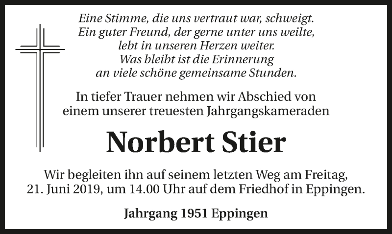 Hier finden Sie alle Traueranzeigen aus der Zeitung, die bisher für Norbert Stier erschienen sind. Weitere Traueranzeigen, die in der Zeitung erscheinen, werden hier ebenfalls aufgelistet