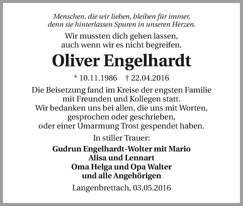 Hier finden Sie alle Traueranzeigen aus der Zeitung, die bisher für Oliver Engelhardt erschienen sind. Weitere Traueranzeigen, die in der Zeitung erscheinen, werden hier ebenfalls aufgelistet