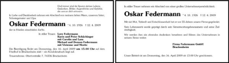 Hier finden Sie alle Traueranzeigen aus der Zeitung, die bisher für Oskar Federmann erschienen sind. Weitere Traueranzeigen, die in der Zeitung erscheinen, werden hier ebenfalls aufgelistet