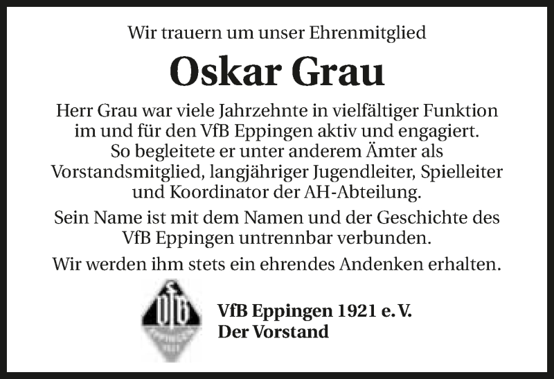 Hier finden Sie alle Traueranzeigen aus der Zeitung, die bisher für Oskar Grau erschienen sind. Weitere Traueranzeigen, die in der Zeitung erscheinen, werden hier ebenfalls aufgelistet