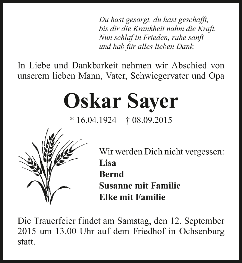 Hier finden Sie alle Traueranzeigen aus der Zeitung, die bisher für Oskar Sayer erschienen sind. Weitere Traueranzeigen, die in der Zeitung erscheinen, werden hier ebenfalls aufgelistet