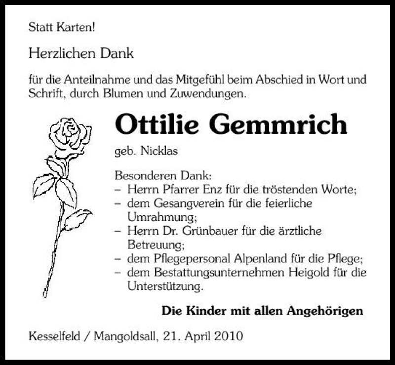 Hier finden Sie alle Traueranzeigen aus der Zeitung, die bisher für Ottilie Gemmrich erschienen sind. Weitere Traueranzeigen, die in der Zeitung erscheinen, werden hier ebenfalls aufgelistet