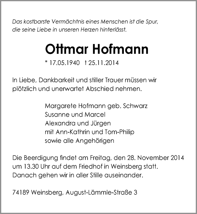 Hier finden Sie alle Traueranzeigen aus der Zeitung, die bisher für Ottmar Hofmann erschienen sind. Weitere Traueranzeigen, die in der Zeitung erscheinen, werden hier ebenfalls aufgelistet