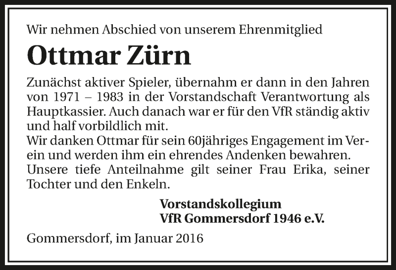 Hier finden Sie alle Traueranzeigen aus der Zeitung, die bisher für Ottmar Zürn erschienen sind. Weitere Traueranzeigen, die in der Zeitung erscheinen, werden hier ebenfalls aufgelistet