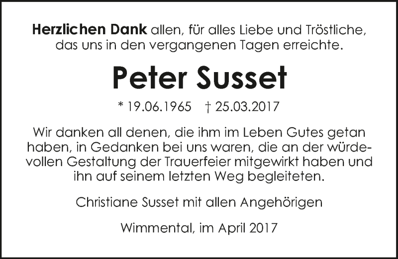 Hier finden Sie alle Traueranzeigen aus der Zeitung, die bisher für Peter Susset erschienen sind. Weitere Traueranzeigen, die in der Zeitung erscheinen, werden hier ebenfalls aufgelistet