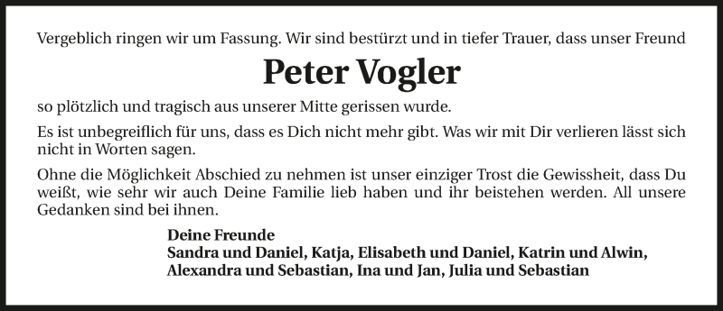 Hier finden Sie alle Traueranzeigen aus der Zeitung, die bisher für Peter Vogler erschienen sind. Weitere Traueranzeigen, die in der Zeitung erscheinen, werden hier ebenfalls aufgelistet