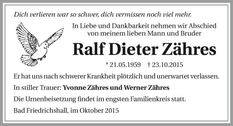 Hier finden Sie alle Traueranzeigen aus der Zeitung, die bisher für Ralf Dieter Zähres erschienen sind. Weitere Traueranzeigen, die in der Zeitung erscheinen, werden hier ebenfalls aufgelistet
