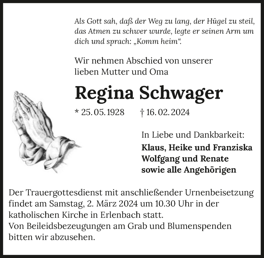 Hier finden Sie alle Traueranzeigen aus der Zeitung, die bisher für Regina Schwager erschienen sind. Weitere Traueranzeigen, die in der Zeitung erscheinen, werden hier ebenfalls aufgelistet