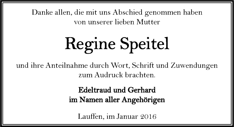 Hier finden Sie alle Traueranzeigen aus der Zeitung, die bisher für Regine Speitel erschienen sind. Weitere Traueranzeigen, die in der Zeitung erscheinen, werden hier ebenfalls aufgelistet