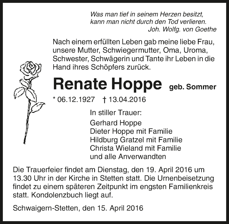 Hier finden Sie alle Traueranzeigen aus der Zeitung, die bisher für Renate Hoppe erschienen sind. Weitere Traueranzeigen, die in der Zeitung erscheinen, werden hier ebenfalls aufgelistet