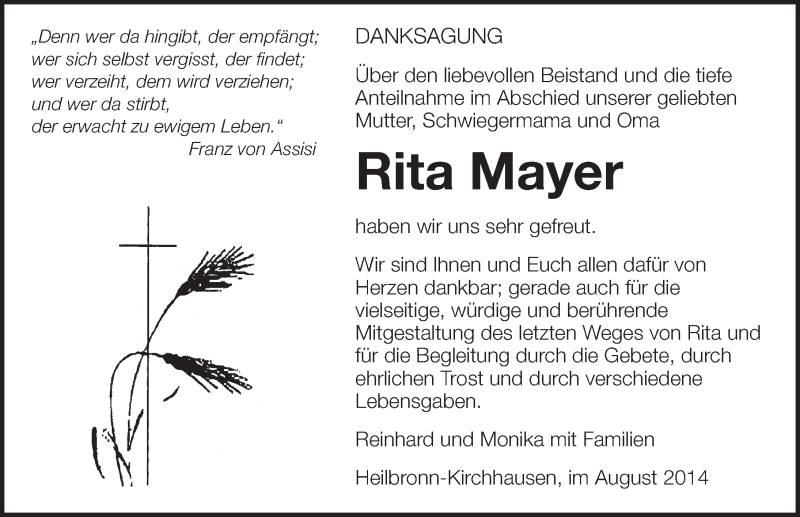 Hier finden Sie alle Traueranzeigen aus der Zeitung, die bisher für Rita Mayer erschienen sind. Weitere Traueranzeigen, die in der Zeitung erscheinen, werden hier ebenfalls aufgelistet