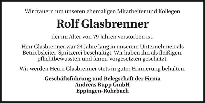 Hier finden Sie alle Traueranzeigen aus der Zeitung, die bisher für Rolf Glasbrenner erschienen sind. Weitere Traueranzeigen, die in der Zeitung erscheinen, werden hier ebenfalls aufgelistet