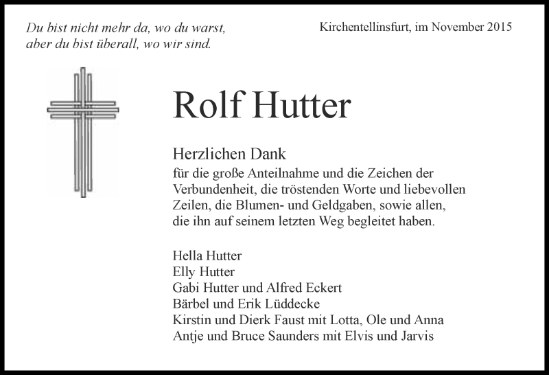 Hier finden Sie alle Traueranzeigen aus der Zeitung, die bisher für Rolf Hutter erschienen sind. Weitere Traueranzeigen, die in der Zeitung erscheinen, werden hier ebenfalls aufgelistet