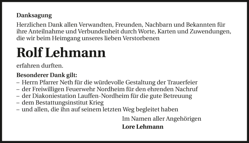 Hier finden Sie alle Traueranzeigen aus der Zeitung, die bisher für Rolf Lehmann erschienen sind. Weitere Traueranzeigen, die in der Zeitung erscheinen, werden hier ebenfalls aufgelistet