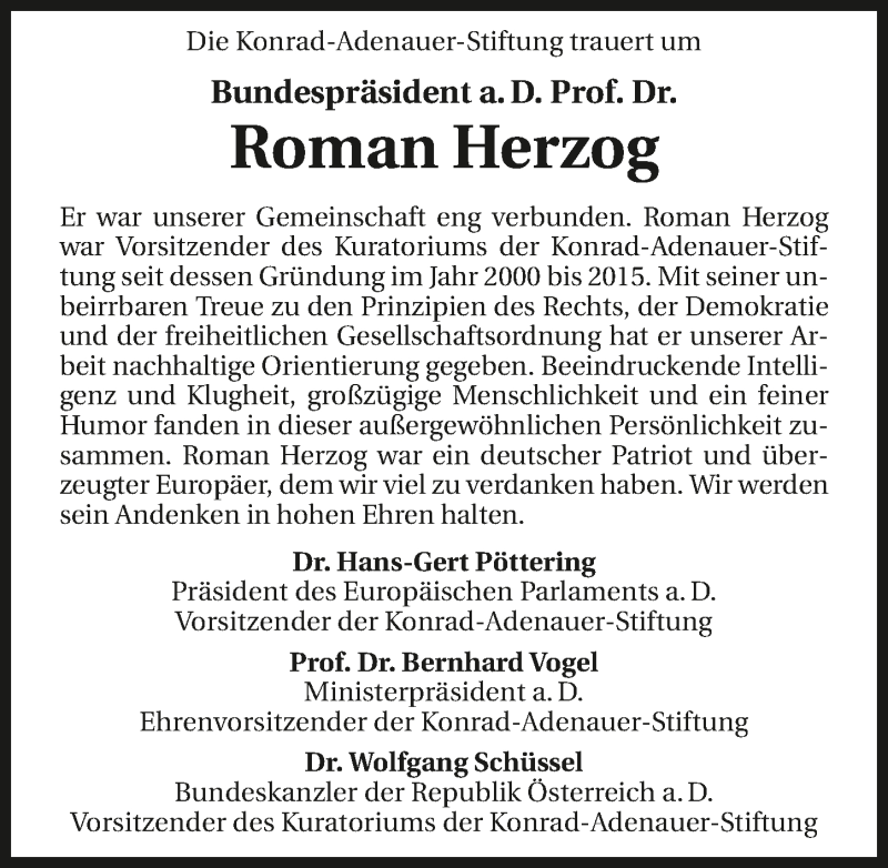 Hier finden Sie alle Traueranzeigen aus der Zeitung, die bisher für Roman Herzog erschienen sind. Weitere Traueranzeigen, die in der Zeitung erscheinen, werden hier ebenfalls aufgelistet