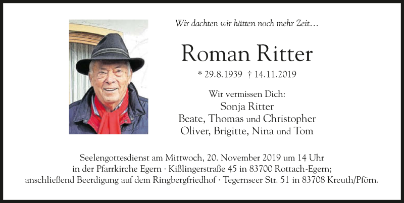 Hier finden Sie alle Traueranzeigen aus der Zeitung, die bisher für Roman Ritter erschienen sind. Weitere Traueranzeigen, die in der Zeitung erscheinen, werden hier ebenfalls aufgelistet