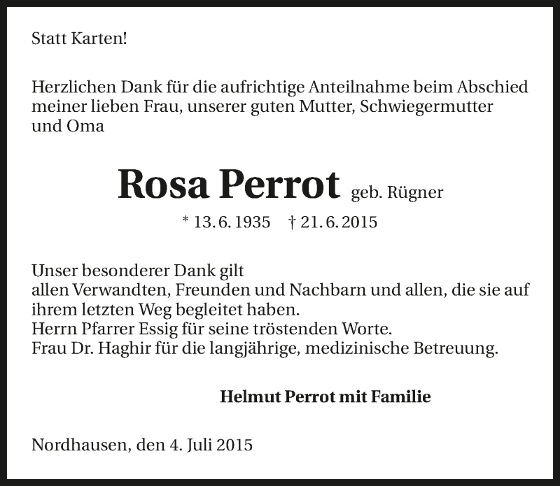 Hier finden Sie alle Traueranzeigen aus der Zeitung, die bisher für Rosa Perrot erschienen sind. Weitere Traueranzeigen, die in der Zeitung erscheinen, werden hier ebenfalls aufgelistet