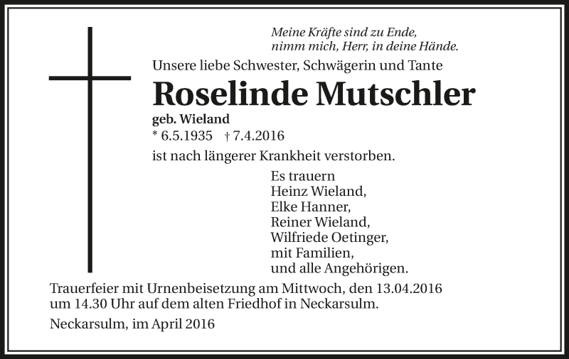 Hier finden Sie alle Traueranzeigen aus der Zeitung, die bisher für Roselinde Mutschler erschienen sind. Weitere Traueranzeigen, die in der Zeitung erscheinen, werden hier ebenfalls aufgelistet