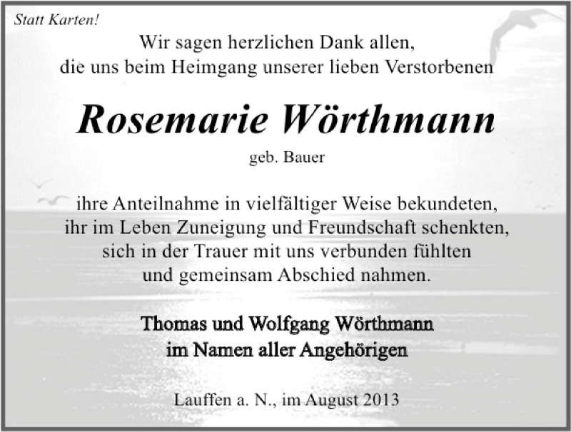 Hier finden Sie alle Traueranzeigen aus der Zeitung, die bisher für Rosemarie Wörthmann erschienen sind. Weitere Traueranzeigen, die in der Zeitung erscheinen, werden hier ebenfalls aufgelistet