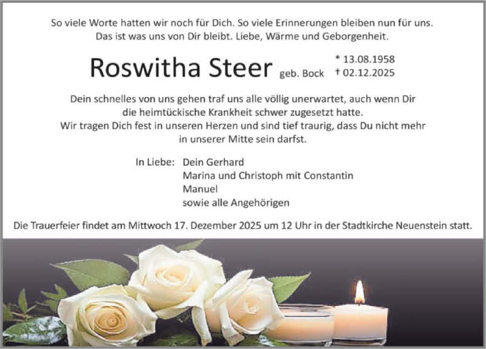 Hier finden Sie alle Traueranzeigen aus der Zeitung, die bisher für Roswitha Steer erschienen sind. Weitere Traueranzeigen, die in der Zeitung erscheinen, werden hier ebenfalls aufgelistet