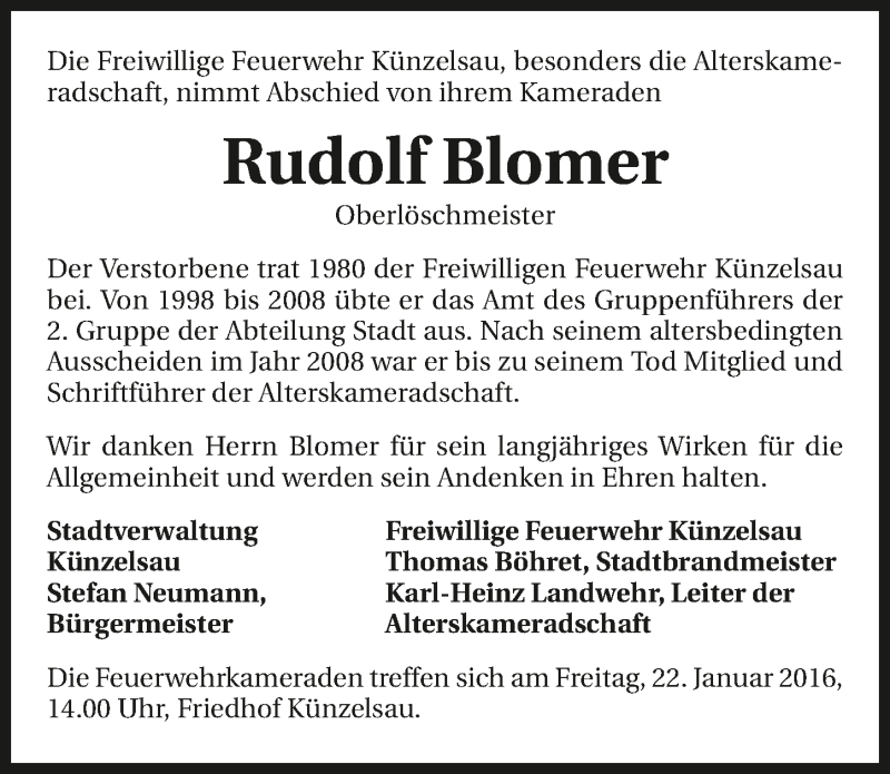 Hier finden Sie alle Traueranzeigen aus der Zeitung, die bisher für Rudolf Blomer erschienen sind. Weitere Traueranzeigen, die in der Zeitung erscheinen, werden hier ebenfalls aufgelistet