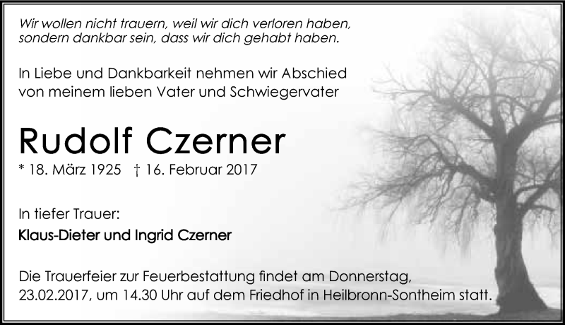 Hier finden Sie alle Traueranzeigen aus der Zeitung, die bisher für Rudolf Czerner erschienen sind. Weitere Traueranzeigen, die in der Zeitung erscheinen, werden hier ebenfalls aufgelistet