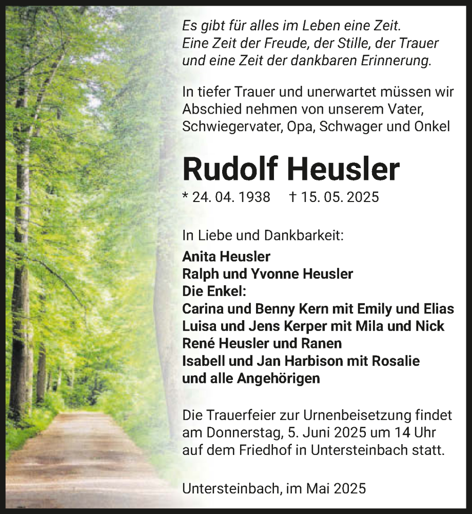 Hier finden Sie alle Traueranzeigen aus der Zeitung, die bisher für Rudolf Heusler erschienen sind. Weitere Traueranzeigen, die in der Zeitung erscheinen, werden hier ebenfalls aufgelistet
