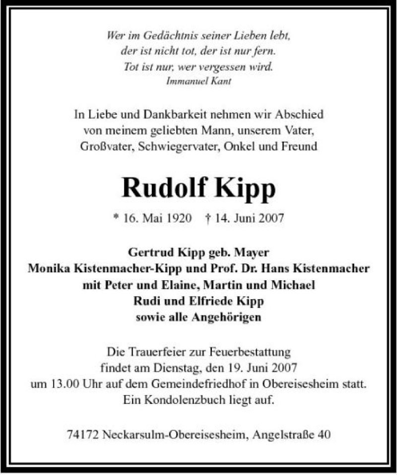 Hier finden Sie alle Traueranzeigen aus der Zeitung, die bisher für Rudolf Kipp erschienen sind. Weitere Traueranzeigen, die in der Zeitung erscheinen, werden hier ebenfalls aufgelistet