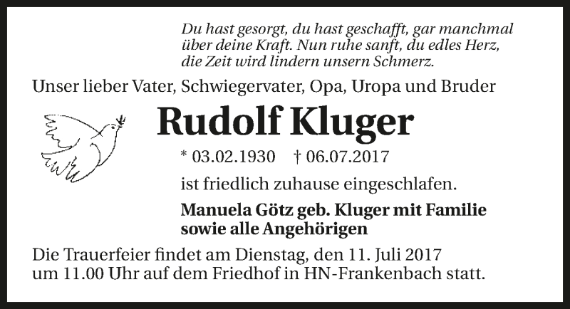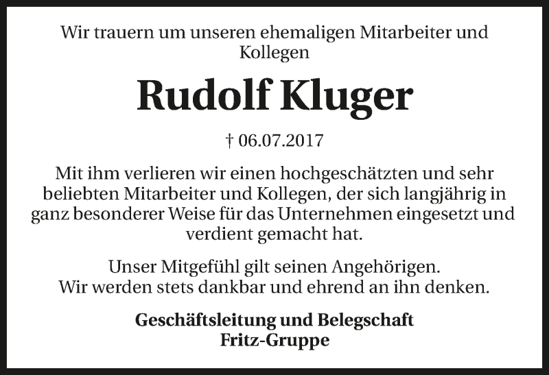 Hier finden Sie alle Traueranzeigen aus der Zeitung, die bisher für Rudolf Kluger erschienen sind. Weitere Traueranzeigen, die in der Zeitung erscheinen, werden hier ebenfalls aufgelistet