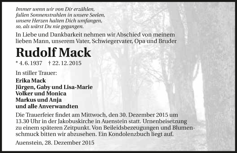 Hier finden Sie alle Traueranzeigen aus der Zeitung, die bisher für Rudolf Mack erschienen sind. Weitere Traueranzeigen, die in der Zeitung erscheinen, werden hier ebenfalls aufgelistet