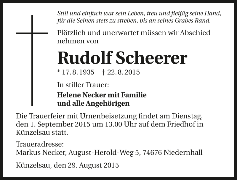 Hier finden Sie alle Traueranzeigen aus der Zeitung, die bisher für Rudolf Scheerer erschienen sind. Weitere Traueranzeigen, die in der Zeitung erscheinen, werden hier ebenfalls aufgelistet