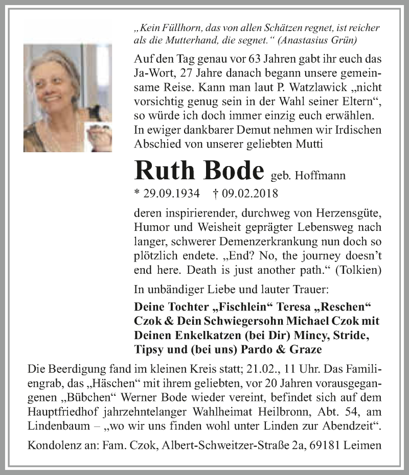 Hier finden Sie alle Traueranzeigen aus der Zeitung, die bisher für Ruth Bode erschienen sind. Weitere Traueranzeigen, die in der Zeitung erscheinen, werden hier ebenfalls aufgelistet