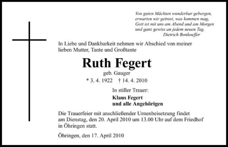 Hier finden Sie alle Traueranzeigen aus der Zeitung, die bisher für Ruth Fegert erschienen sind. Weitere Traueranzeigen, die in der Zeitung erscheinen, werden hier ebenfalls aufgelistet